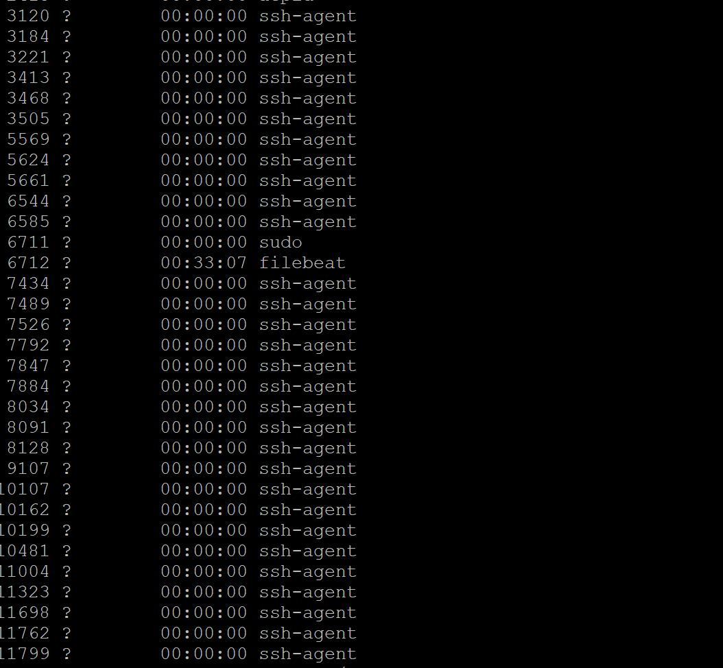 출력해보니, ssh-agent 라는 프로세스가 굉장히 많이 눈에 띄었는데요, 해당 프로세스는 EC2에 ssh 접속을 하고 제대로 종료를 안하면 쌓이는 프로세스였습니다.