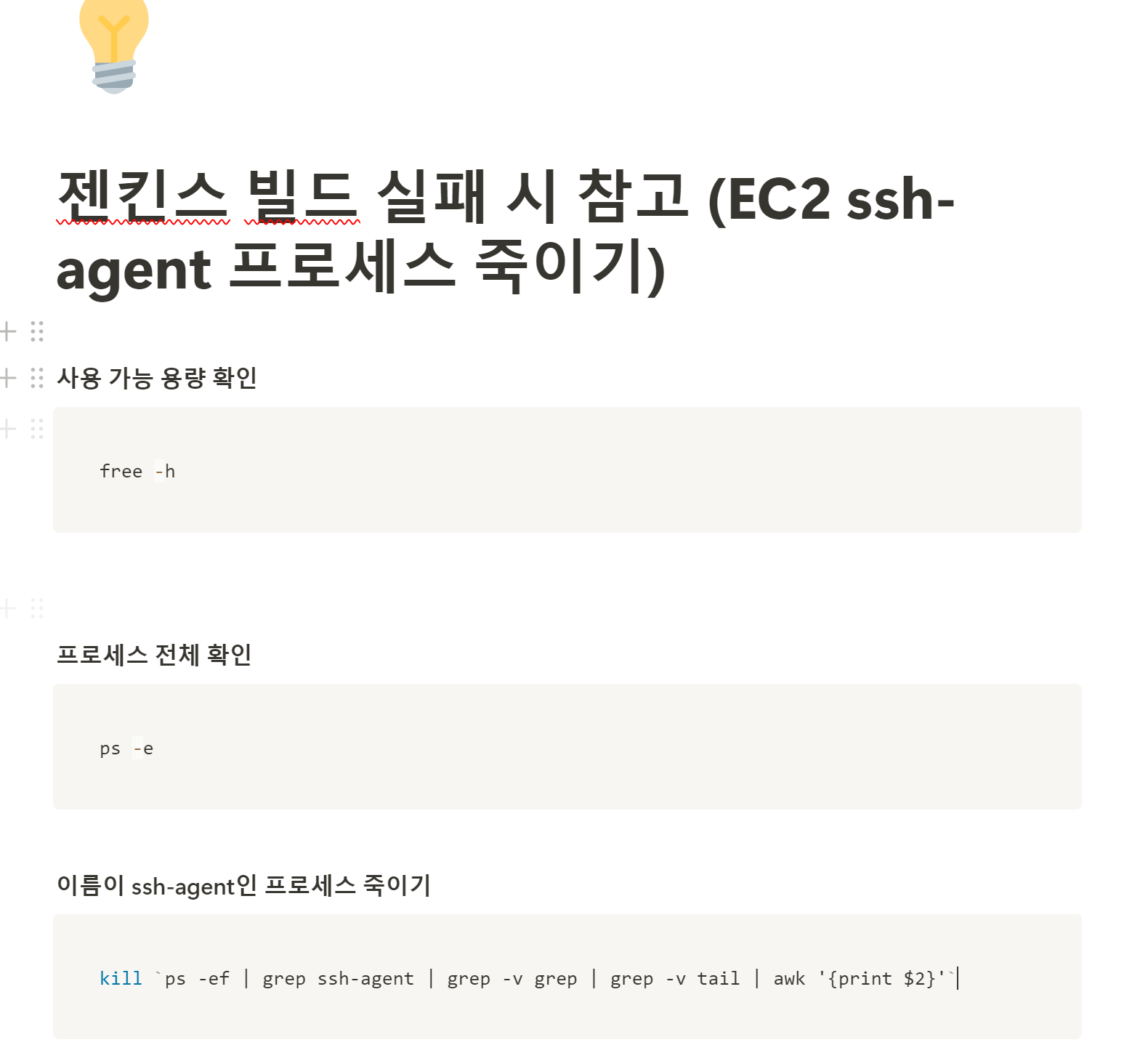 일단은 ssh-agent 프로세스가 쌓이지 않도록 빌드가 끝난 뒤에는 정상적으로 프로세스를 종료해주어야 하겠으나, 아직까진 개발서버에서만 발생하고 있기에 젠킨스에서 빌드 실패 시 해당 명령어를 통해 ssh-agent 프로세스를 주기적으로 지워주는 방법을 선택하였습니다.