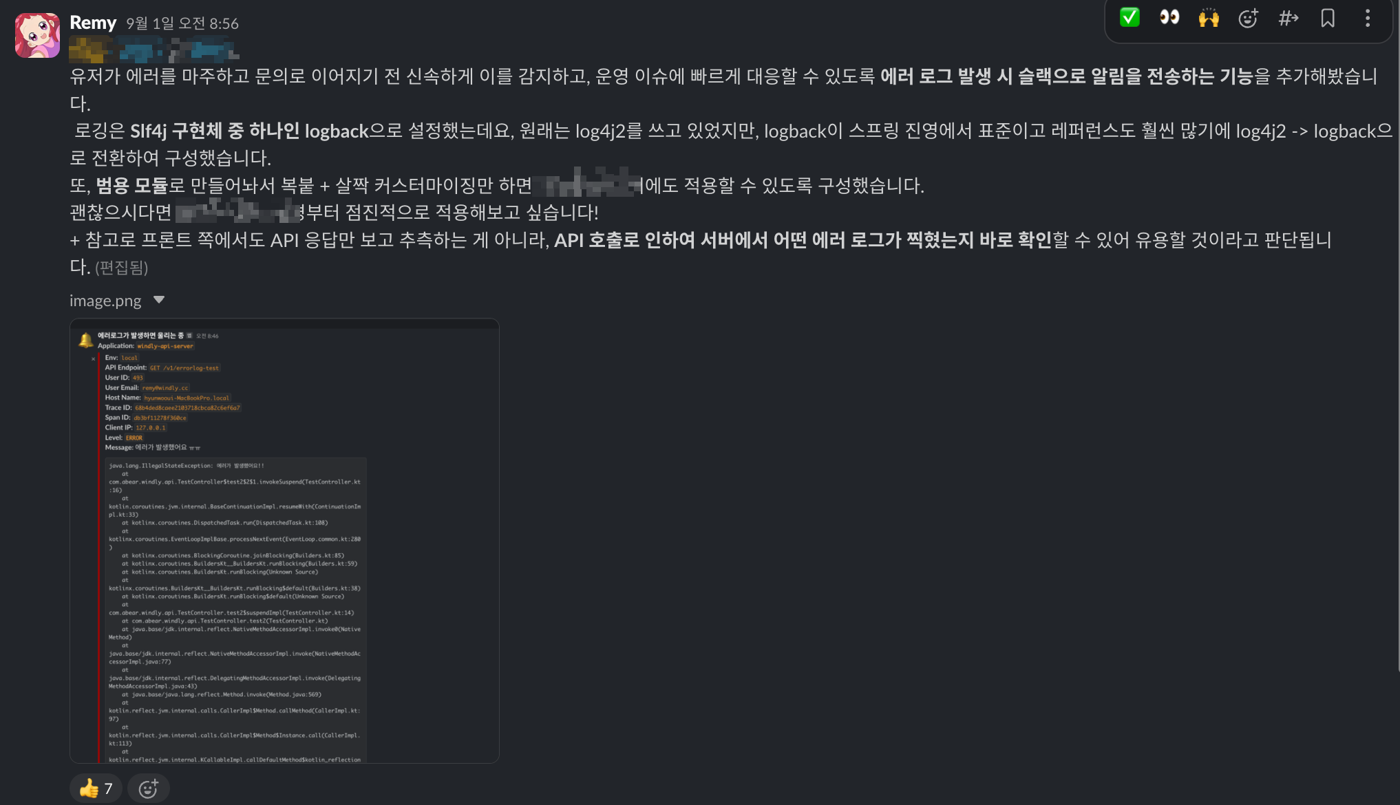 그래서 비용이 들지 않는 선에서 먼저 할 수 있는 조치를 고민했고, logback을 활용하여 ERROR 레벨 이상의 로그를 슬랙 채널로 전송하는 방식으로 알림 시스템을 구성하여 적용했다.