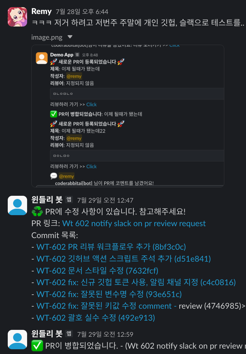 - 최초 리뷰요청 스레드에서 모든 후속 알림을 이어붙여 맥락 유지
